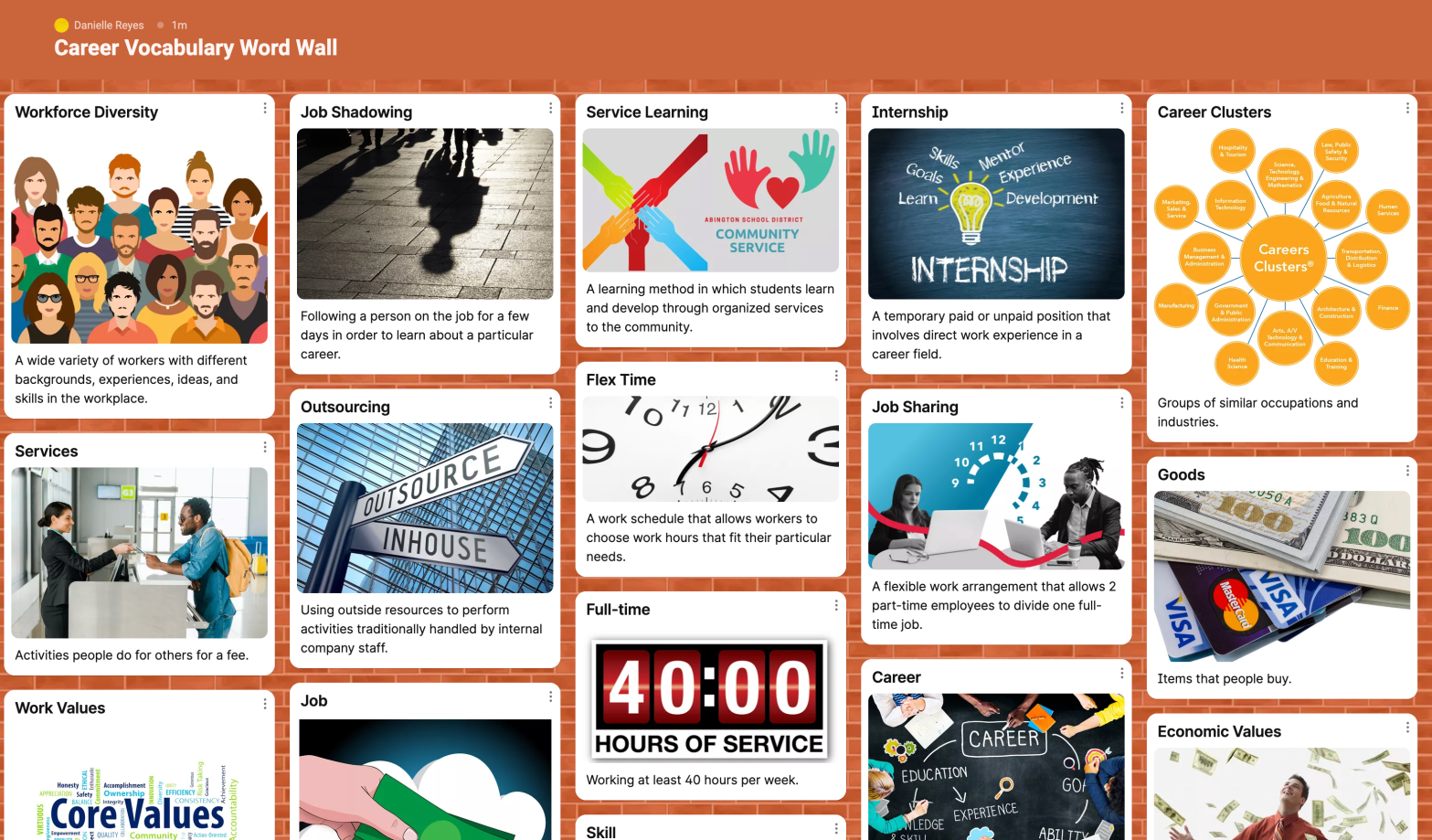 Word walls are wonderful visual tools to help anchor students to new academic vocabulary. A great strategy is using a true physical wall, whiteboard, or piece of chart paper in your classroom to house a word wall. If you’re tight on space or don’t teach in a physical classroom, Padlet can be a great alternative. Padlet is a free digital bulletin board tool. It has various layouts including grid view (shown below), shelves, maps, timeline, canvas, backchannel, and more. You can use Padlet to inspire student-voice and allow students to post text, images, videos, links, etc. You can also create a “view-only” Padlet where students are viewing the Padlet. This is what is shown below: