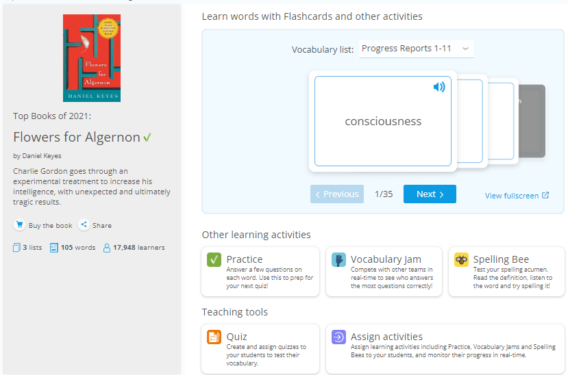 Vocabulary.com has an abundance of resources including pre-made vocabulary lists, games, quizzes, and activities. Simply type in the title of a story, chapter, or concept you are reading or learning about into the search and it is likely a list is already made.